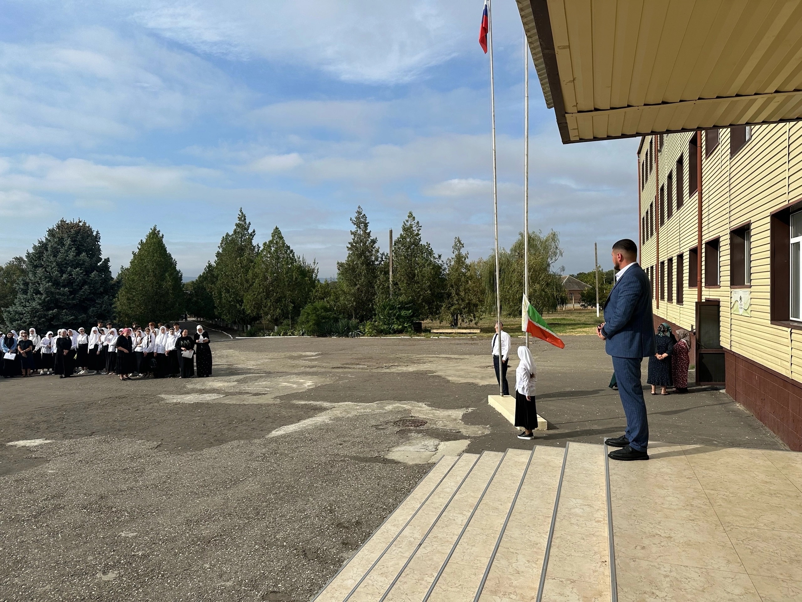 09.09.2024Рабочая неделя в МБОУ «Наурская СОШ 2» уже традиционно начинается с поднятия государственных флагов и звучания гимнов РФ ЧР.